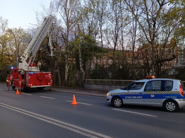 W środę (22.04) około godziny 19.50 strażnicy miejscy na ulicy Wincentego Pola zabezpieczali jezdnię i chodnik nad którym zwisał ogromny konar stwarzający zagrożenie dla pieszych i pojazdów. W celu usunięcia zagrożenia dyżurny Straży Miejskiej poprosił Państwową Straż Pożarną. Strażnicy zabezpieczyli drogę i chodnik na czas usuwania zagrożenia.